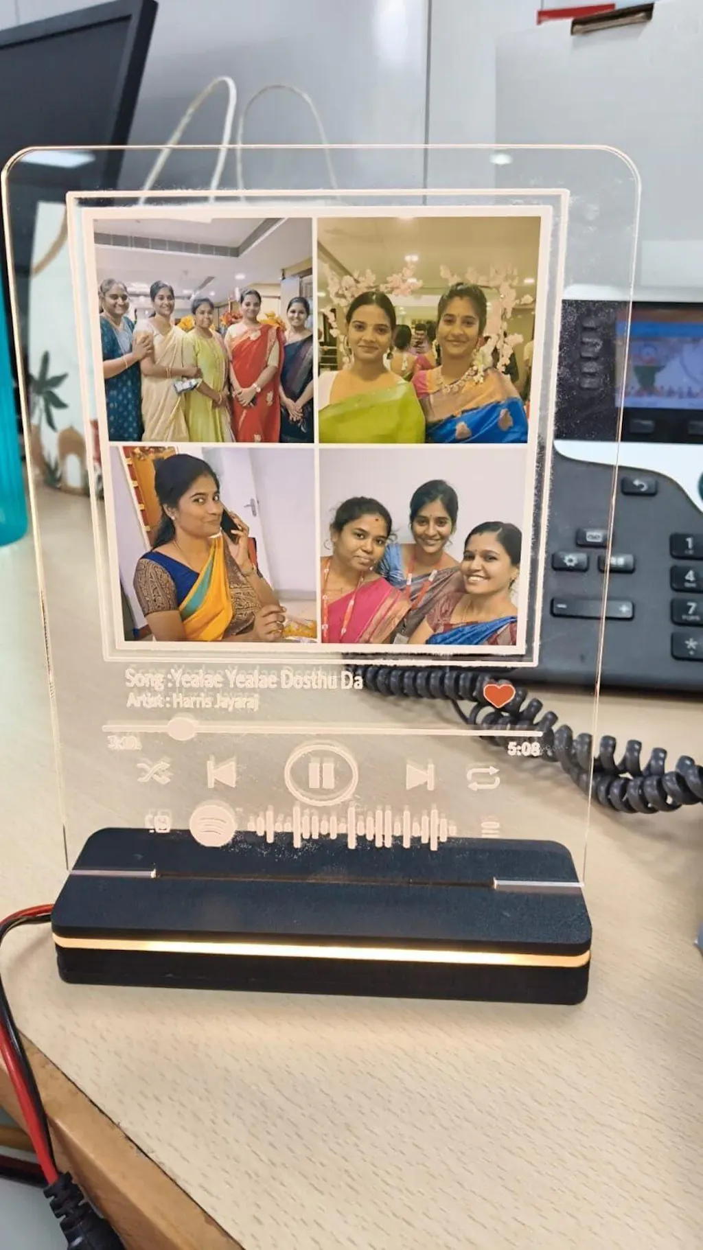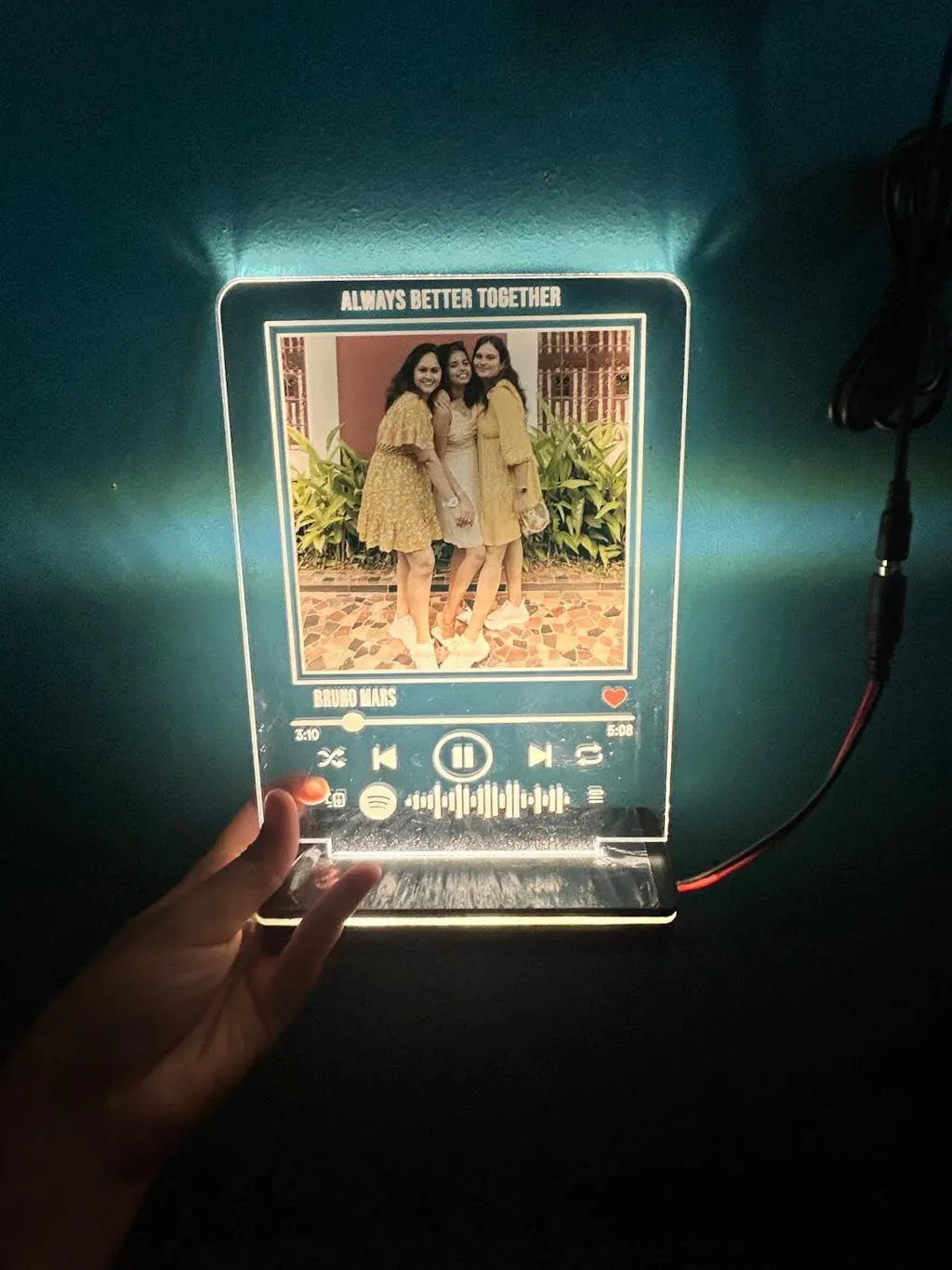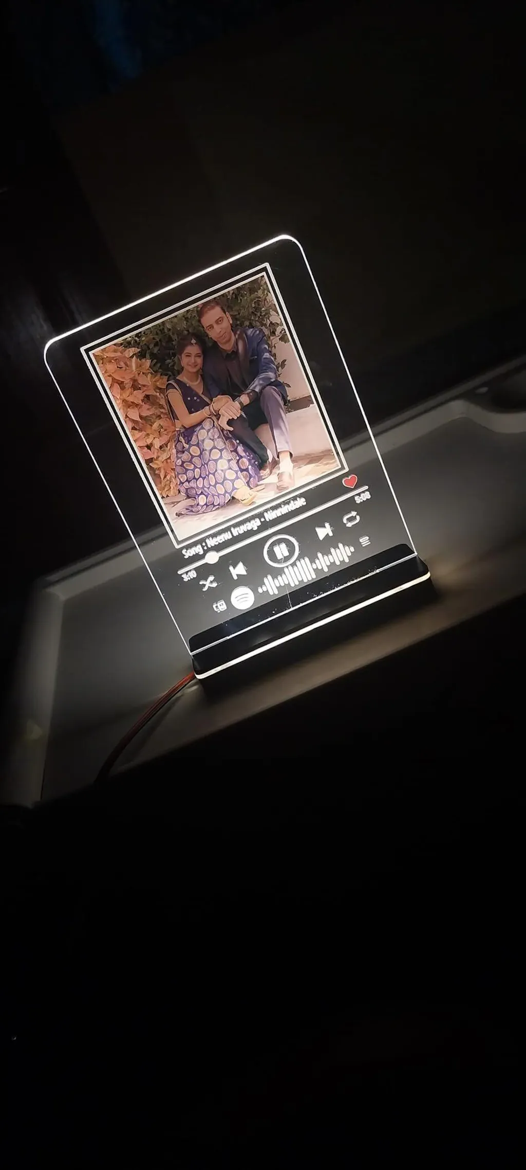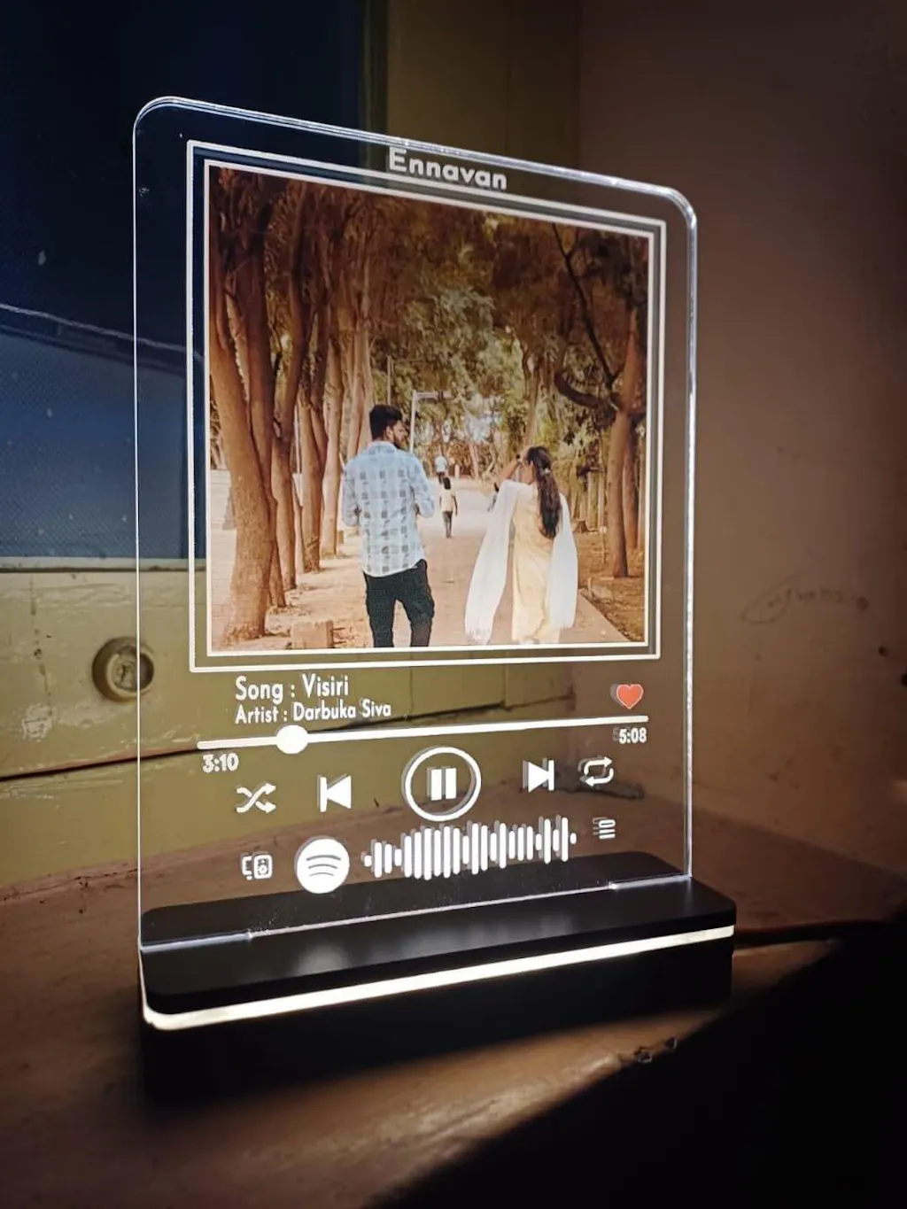 - This elegant acrylic display features a customizable LED-lit design resembling a Spotify music player interface, making it an ideal personalized gift. Perfect for commemorating special moments,